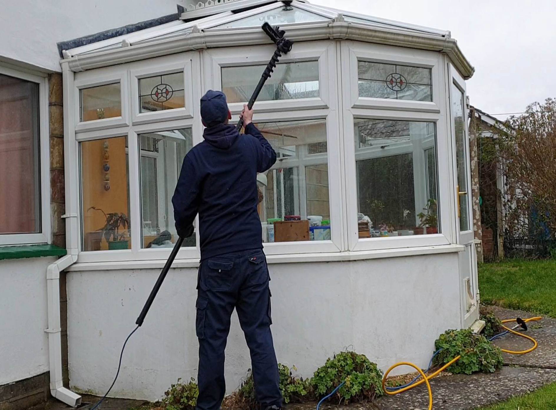 Chez Thomas Gledhill Nettoyage, nous utilisons un système d'aspiration haute portée pour éliminer en toute sécurité les feuilles, mousses et débris — sans avoir besoin d'échelles.